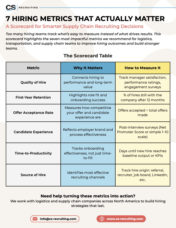Too many hiring teams track what’s easy to measure instead of what drives results. This scorecard highlights the seven most impactful metrics we recommend for logistics, transportation, and supply chain teams to improve hiring outcomes and build stronger teams.