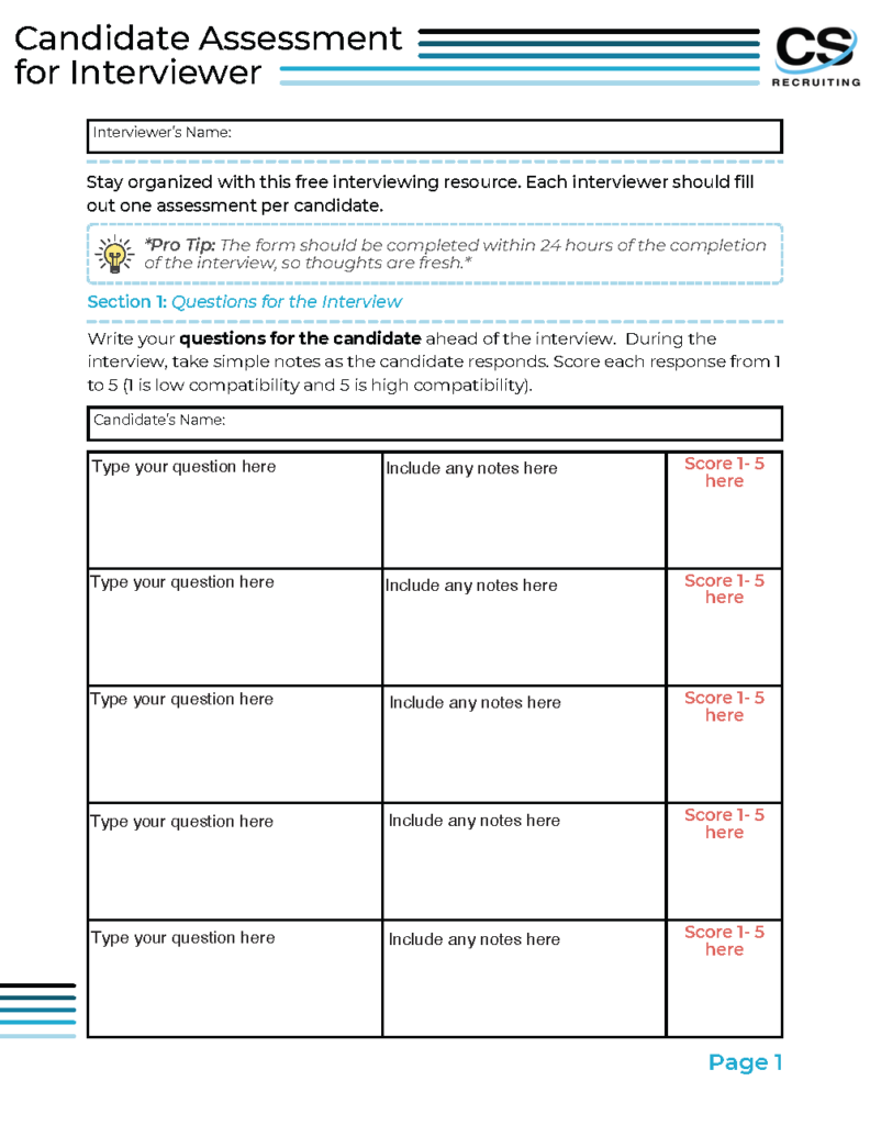Our Interview Assessment + Feedback Template is an essential tool for hiring managers and interviewers to organize and evaluate candidate interviews effectively. This template allows interviewers to score candidates on various criteria, such as hard skills, soft skills, and cultural fit, ensuring a thorough and consistent evaluation process. With sections dedicated to pre-interview questions, post-interview reflections, and team debrief discussions, this resource helps streamline the decision-making process and promotes a collaborative approach to hiring.