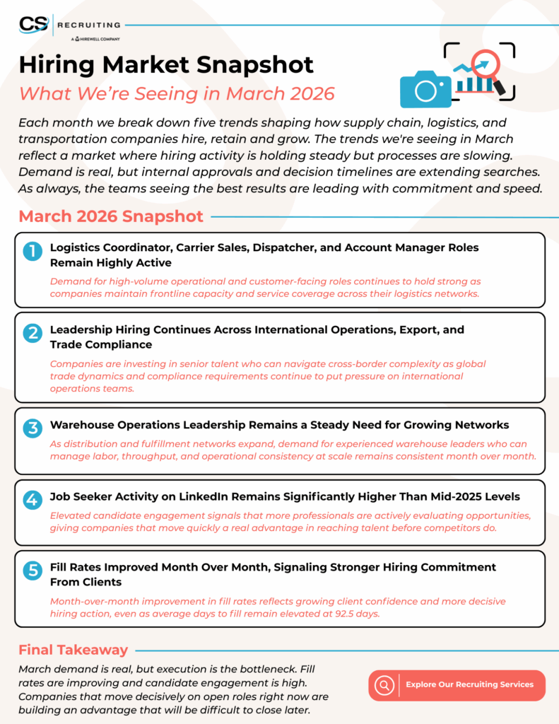 Each month we break down five trends shaping how supply chain, logistics, and transportation companies hire, retain and grow. The trends we're seeing in March reflect a market where hiring activity is holding steady but processes are slowing. Demand is real, but internal approvals and decision timelines are extending searches. As always, the teams seeing the best results are leading with commitment and speed.
