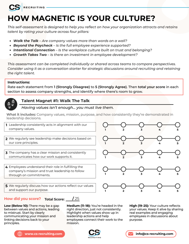 This assessment can be completed individually or shared across teams to compare perspectives. Consider using it as a conversation starter for strategic discussions around recruiting and retaining the right talent.