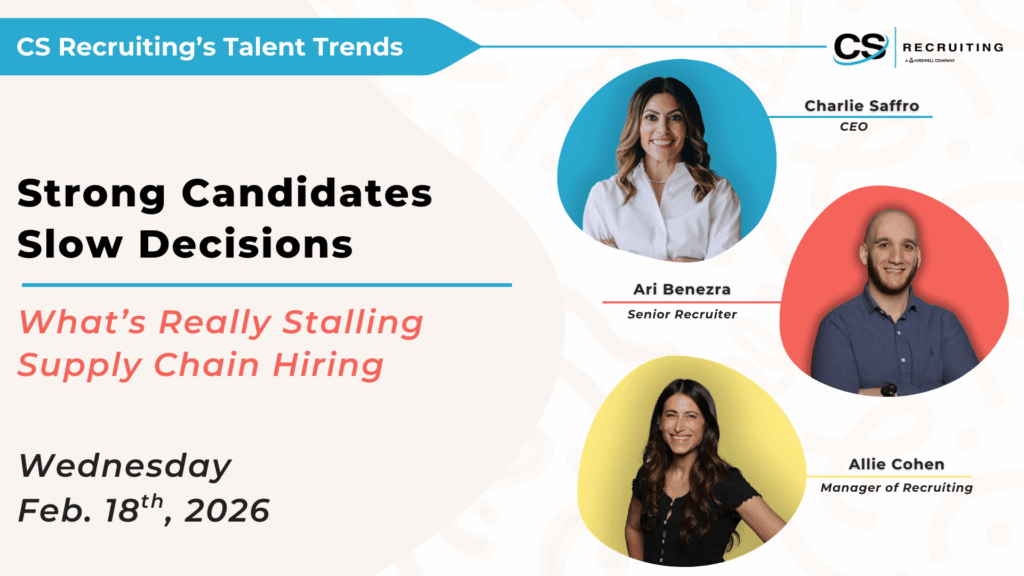 Hiring hasn’t stopped in supply chain, logistics, and transportation but it has slowed. Join Charlie Saffro, Ari Benezra and Allie Cohen from the CS Recruiting team for a live Talent Trends conversation on what’s really stalling hiring decisions right now. We’ll share what we’re seeing across the market, where hiring processes are getting stuck, and what successful teams are doing to move faster without lowering the bar.